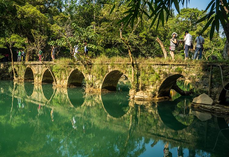 小七孔风景区位于荔波县城南部的群峰之中,景区响水河上横跨着一座青石砌成的七孔拱桥,故而得名。景区融山、水、林、洞、湖泊和瀑布为一体,秀美幽静,加上浓郁的土家和瑶族风情,使得小七孔景区声名大噪。从景区东大门进入后,就可以乘坐景区电瓶车逐个景点游玩了。游览小七孔景区的标志——小七孔古桥,再看看68级跌水瀑布。然后欣赏小七孔最漂亮的地方之一——水上森林,这里是拍摄风景大片的好地方。继续向前来到卧龙潭,这个地方很像九寨沟,宛若人间仙境。最后可以游玩小七孔景区的压轴景点——鸳鸯湖,鸳鸯湖湖水碧绿凝重,因湖中有两棵并排参天的大树而得名。景区游玩一圈大约2-3小时,每个景点旁都有商贩售卖烤玉米、炸小鱼和茶叶蛋等小食,走累了,可以随便找一家坐下,休息一下顺便填饱肚子,再继续上车前往下一个点。游玩结束,可以原路返回,或者直接从西大门出景区。